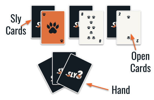 Deal each player 3 cards face down (the Sly Cards), three cards face up (the Open Cards) and 3 cards for their Hand.